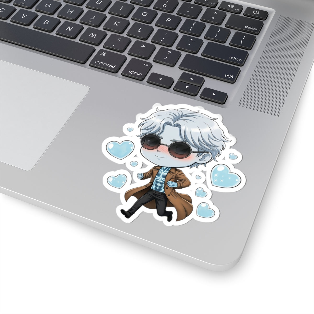Our Cutie Monsters Theodore Marvel is serving smooth, supernatural flirt. This chibi Invisible Man is striding forward in his trench coat and shades, cheeks softly blushing while blue, shimmery hearts float all around. You can see just enough of his glowing, not-quite-there body to know he’s absolutely on his way to someone special—who that is is totally your call.