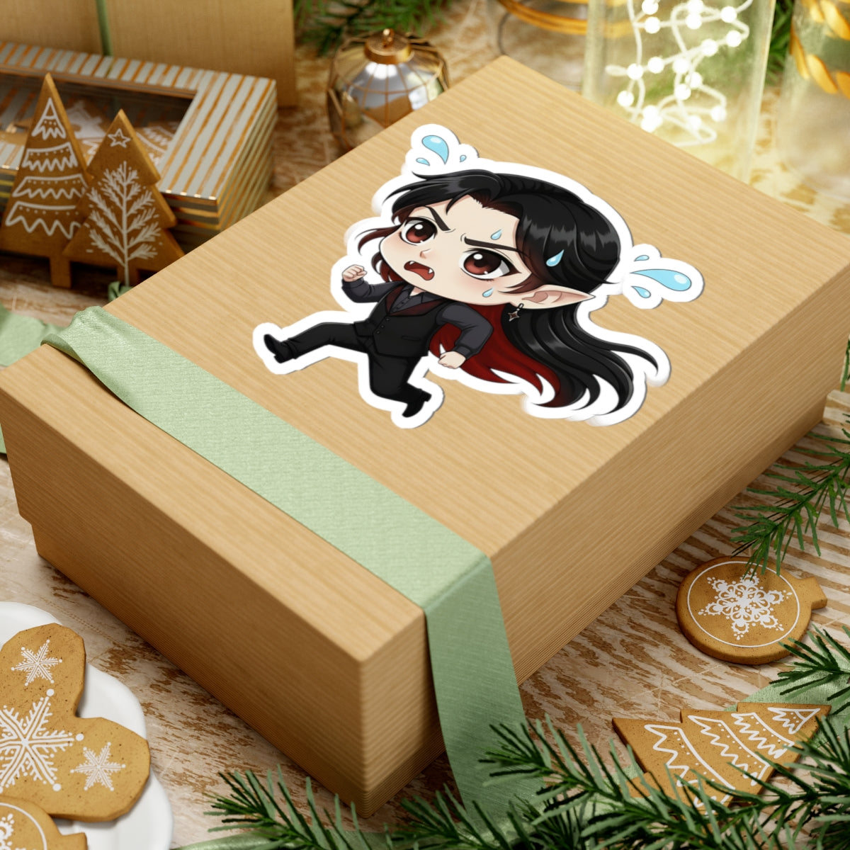 Stick him on laptops, water bottles, notebooks, game consoles, or anywhere you want a little flustered, overdramatic vampire energy in your life.