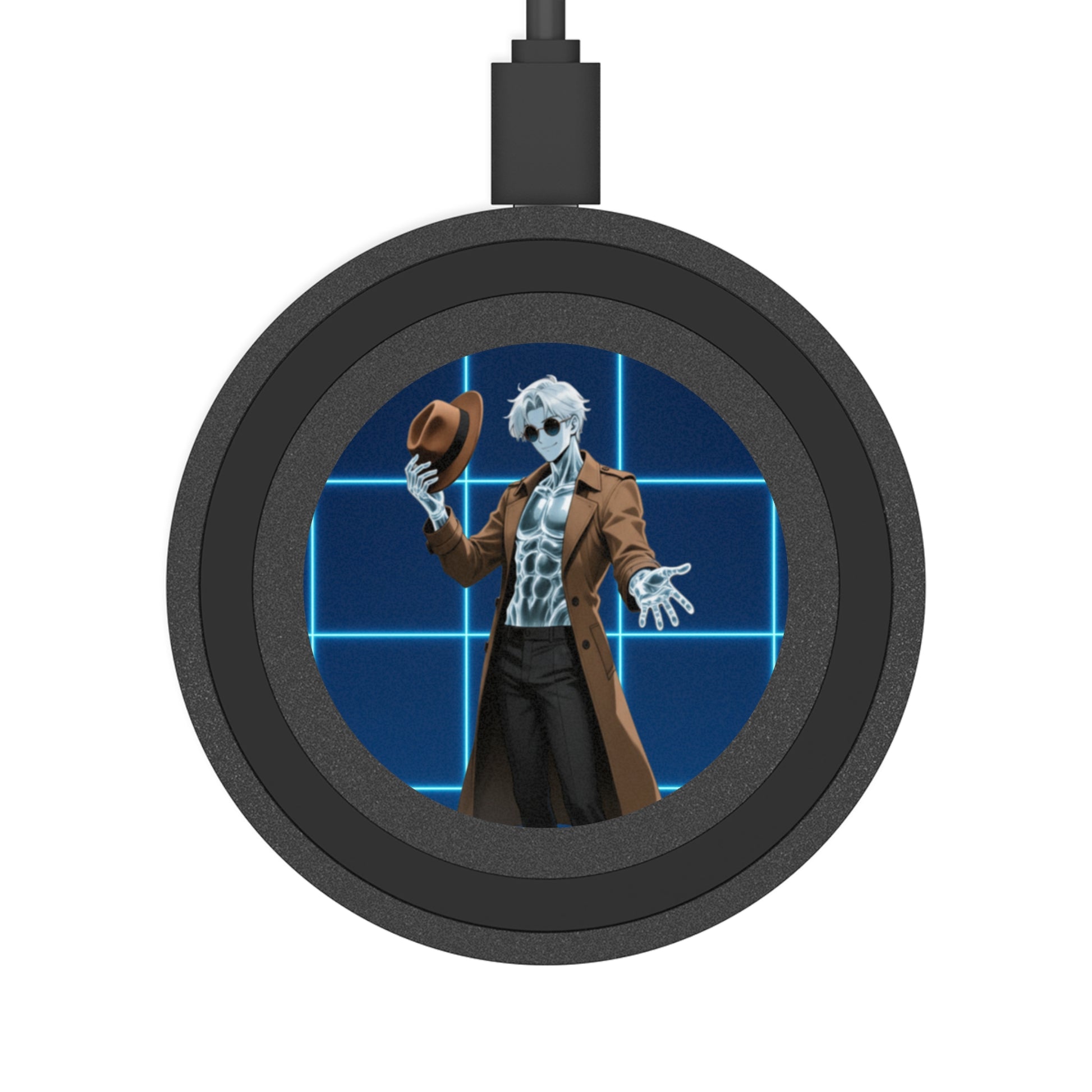 Keep your phone juiced while you flirt with the unknown. This sleek wireless charging pad stars Theodore Marvel, our anime-style Invisible Man—clean lines, crisp detail, and “I may have caused this lab accident, but you’re welcome” energy.